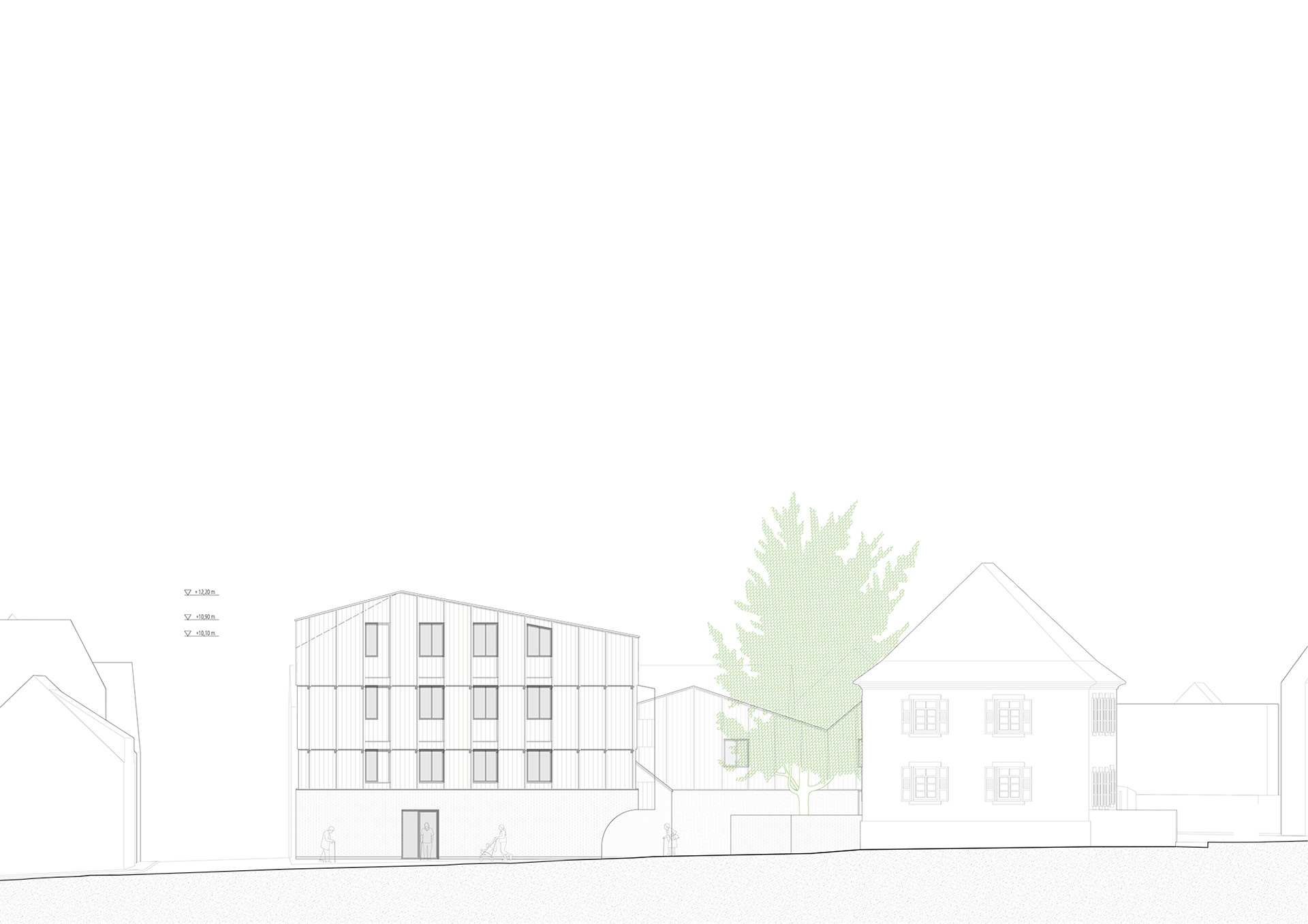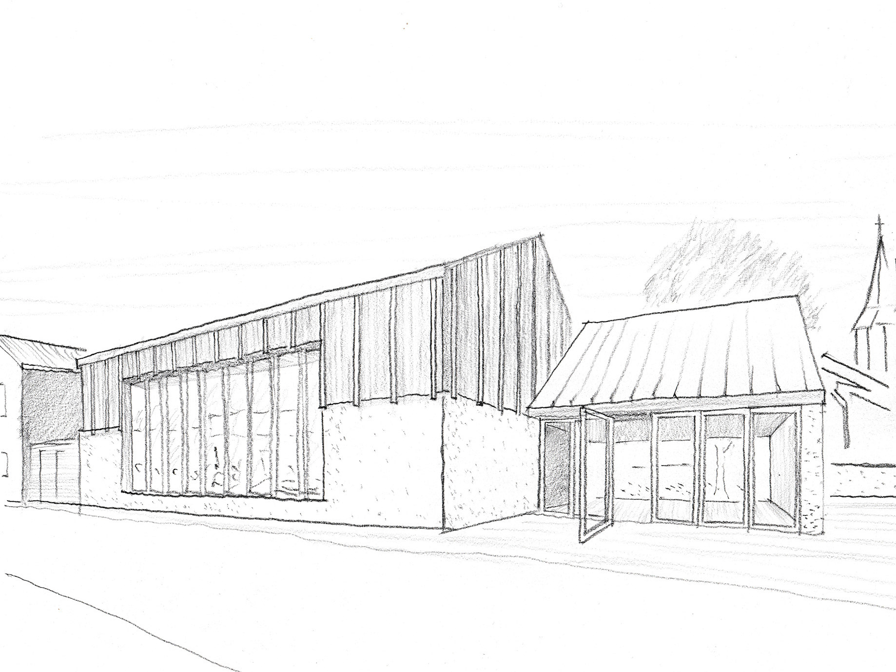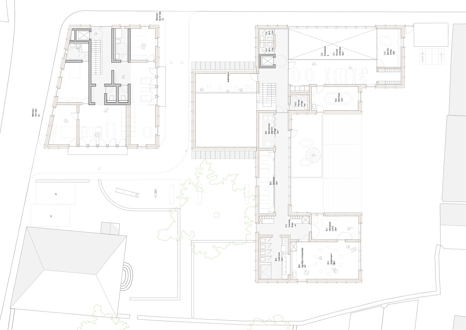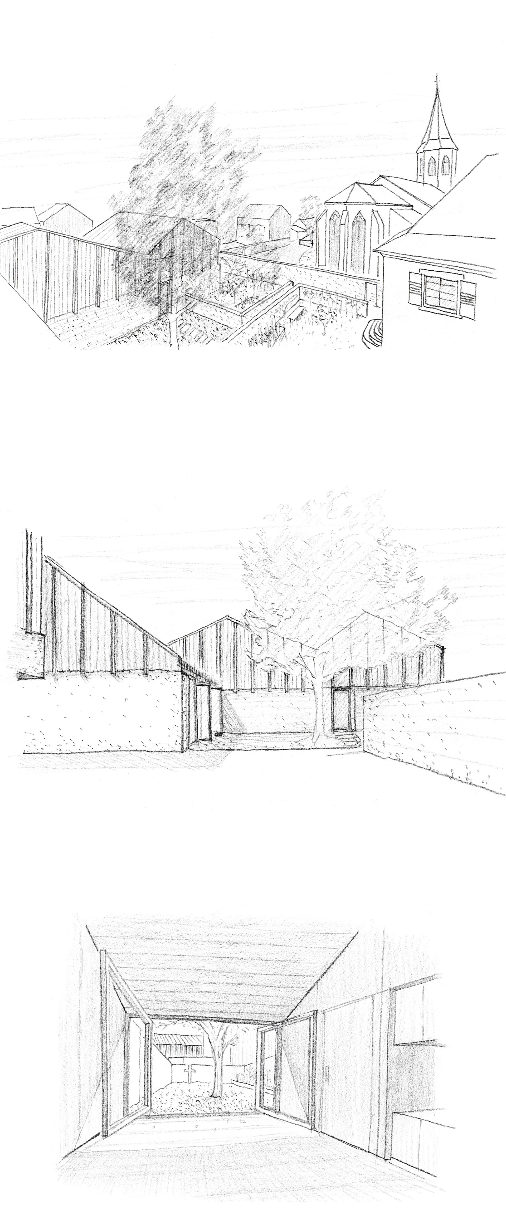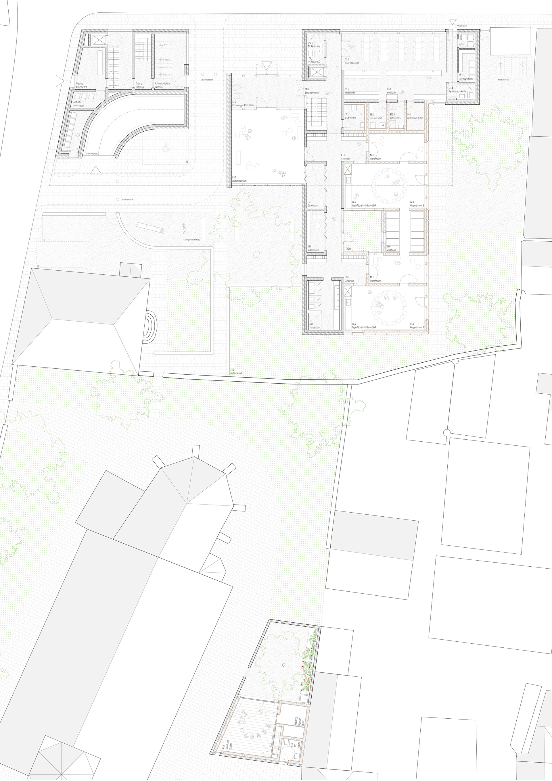 Ausgangspunkt für den Entwurf ist ein räumliches Motiv, welches den Kirchenbau, die Einfriedungen, Bäume und Dorfstruktur aufgreift und stärkt. Der Blick auf Chor und Kirchturm ist allgegenwärtig und bildet den Hintergrund für vielfältige gefasste Außenräume. Wege, Höfe und Gärten mit unterschiedlichem Charakter laden zum Spielen, Spazieren und Verweilen ein. Hier ist für jeden Menschen ein besonderer Ort zu finden. Die Nutzungen sind bis auf den neuen Andachtsraum faktisch in einem großen Gebäude untergebracht welche als Einheit verschiedener Häuser auftritt. Kindergartengruppen, Kinderrestaurant mit Verwaltung, Mehrzwecksaal und Wohnungen bilden eigene Baukörper die die Zugehörigkeit in dieser komplexen Anlage stärken und die Einbindung in die dörfliche Bebauung erreichen. Einheiten wie der Mehrzwecksaal können so außerdem autark genutzt werden und stehen doch mit anderen Nutzungen in Verbindung. Der Aufbau der Häuser entwickelt sich aus den eindrücklichen Besonderheiten dieses dörflichen Raums mit seinen Sandsteinsockeln, den wunderschönen Einfriedungen und starken Baukörpern. Im Erdgeschoss verschmelzen die Fassungen der Außenräume mit den Häusern und gewähren durch prägnante Öffnungen Zugang und Einblick wo dieser erwünscht ist. Die Architektur schützt hier wie im Bestand den intimen Charakter der Freiräume. Darüber erheben sich leichte Holzbauten die dörfliche Motive erneuern und sich dabei eindeutig zeitgemäß ausdrücken. Sie versprechen helle Innenräume und Behaglichkeit. Die Wahl des Holzbaus berücksichtigt Bedürfnisse der Nutzer und Gäste genauso wie die Verantwortung gegenüber Umwelt und Ressourcen. Hier werden lange bestehende Bauweisen zeitgemäß genutzt um auf heute gesellschaftlich relevante Herausforderungen zu antworten.